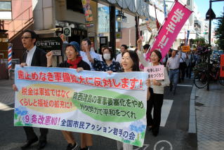 参加者は「安保法制いますぐ廃止」「戦争準備の軍拡反対」「戦闘機買うより食料守れ」と元気よくコールし、繁華街を行進。通行人の注目を集めました。